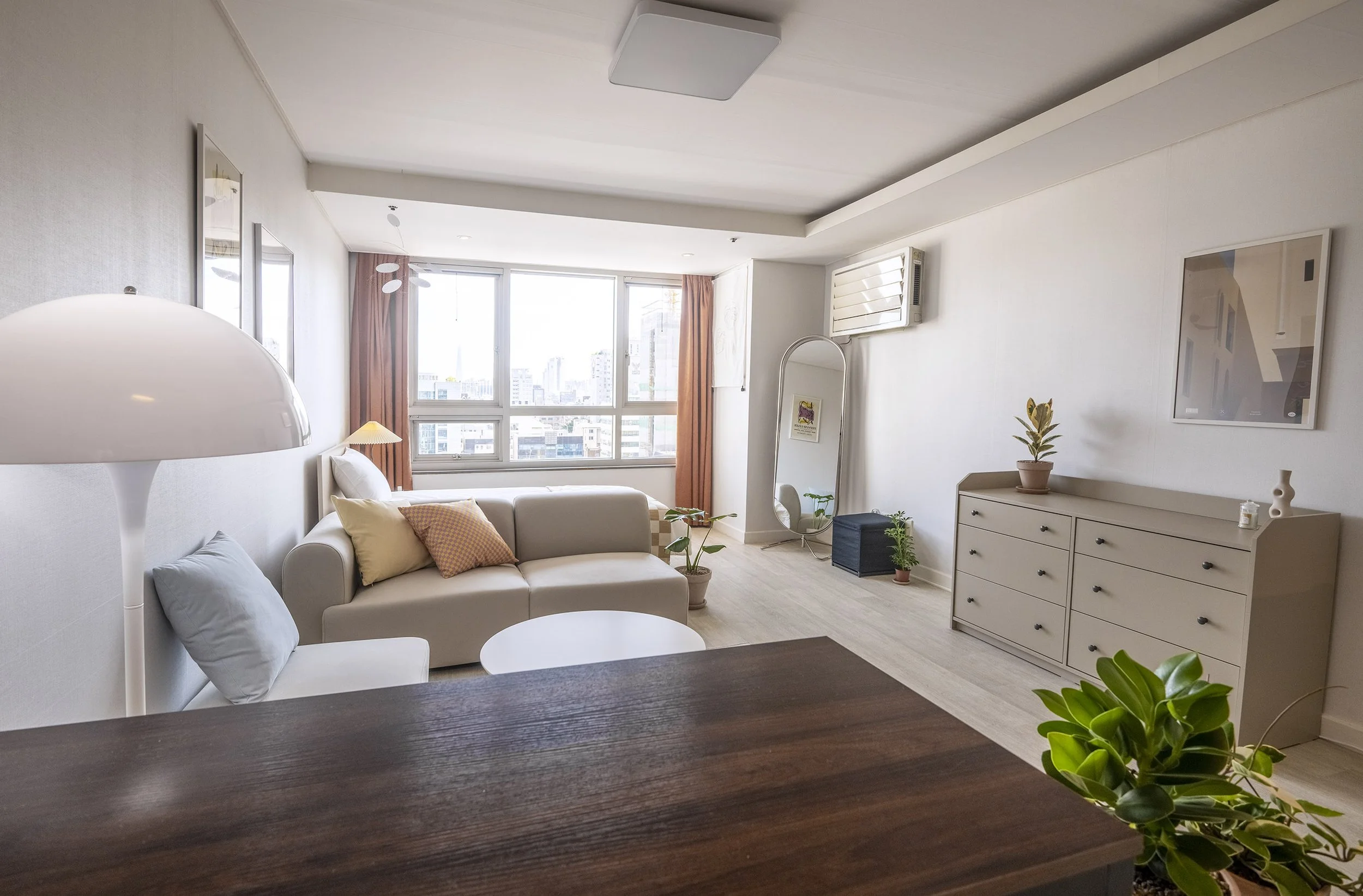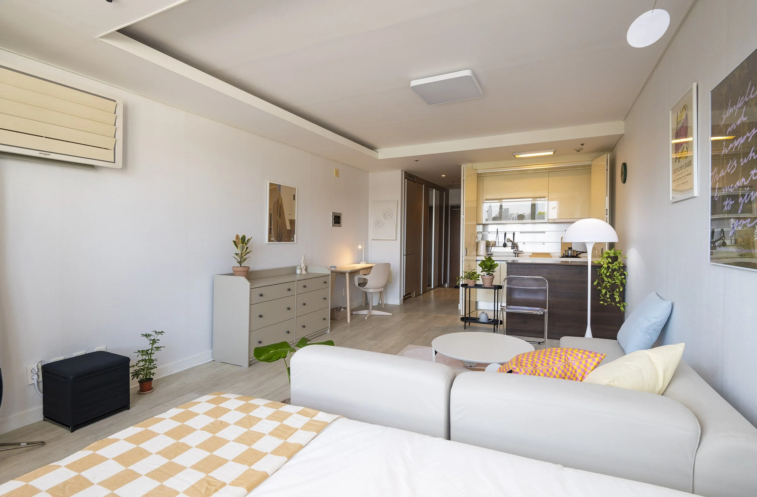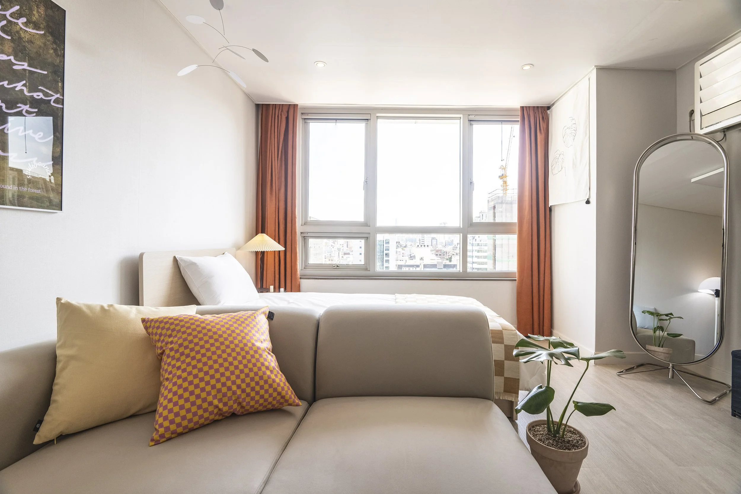 3인 소파가 있어 편하게 대화를 나눌 수 있고 은은한 조명으로 따듯함을 느낄 수 있어요. 밤에는 롯데타워 야경을 보며 와인 한 잔 즐겨보세요. 소셜과 힐링에 최적화된 공간이에요.