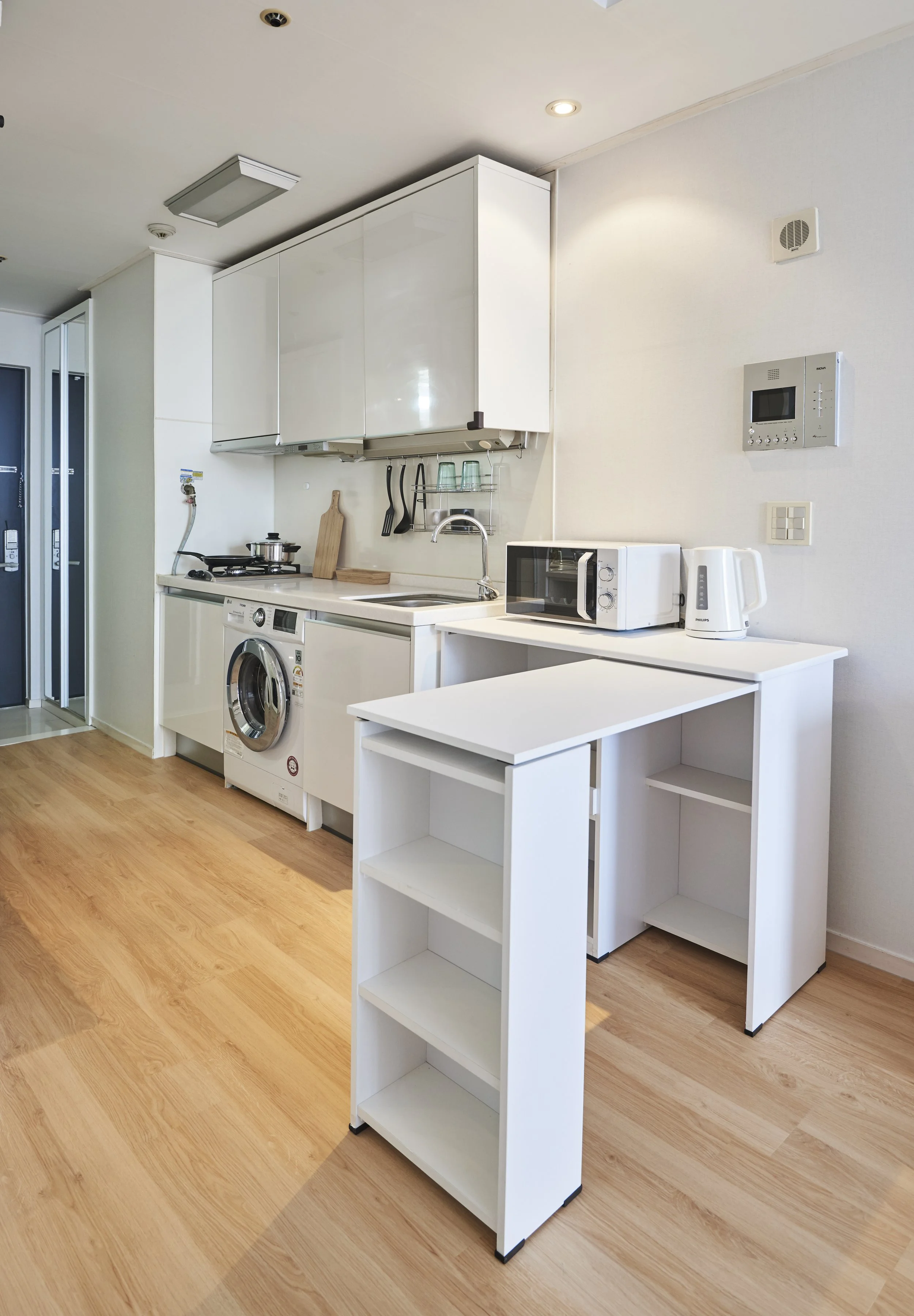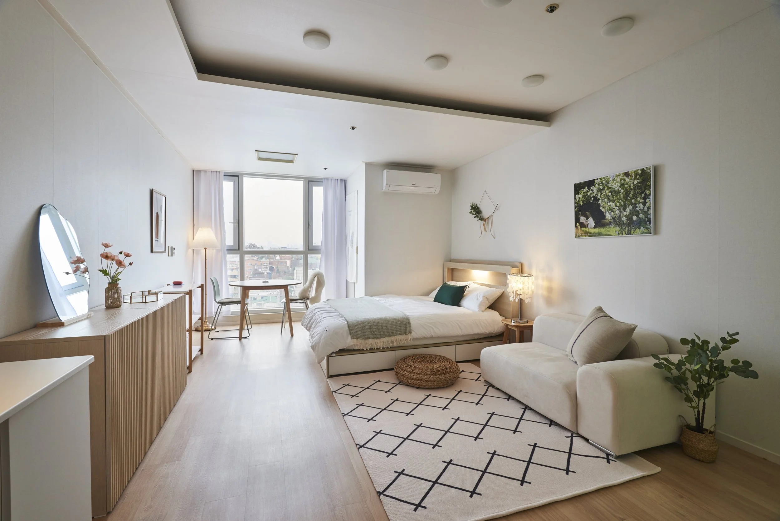 아침 햇살이 많이 들어오는 게 이 공간의 매력이에요. 전체적인 베이지 톤으로 디자인 되었으며, 창가 쪽 라운드 테이블에 앉아 브런치를 먹거나 재밌는 계획을 세워보세요. 하루의 시작이 새롭게 느껴지실 거예요.