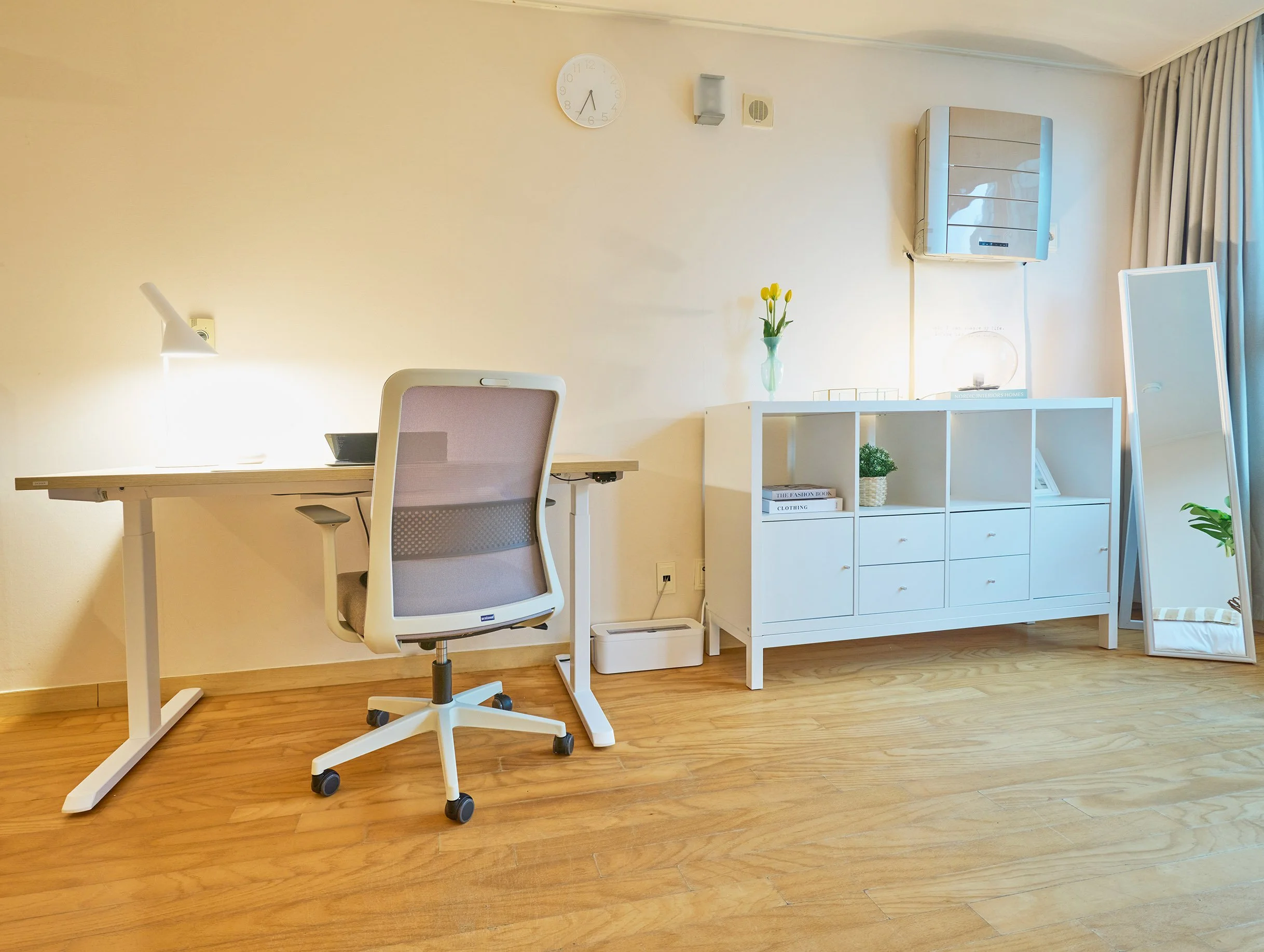 해가 잘 들어오고 밝은 에너지를 느낄 수 있는 곳이에요. 소파에 앉아 창밖을 보고 있으면 마음이 편안해져요. 몰입이 필요할 때는 모션데스크를 사용하여 업무 효율을 높여보세요.