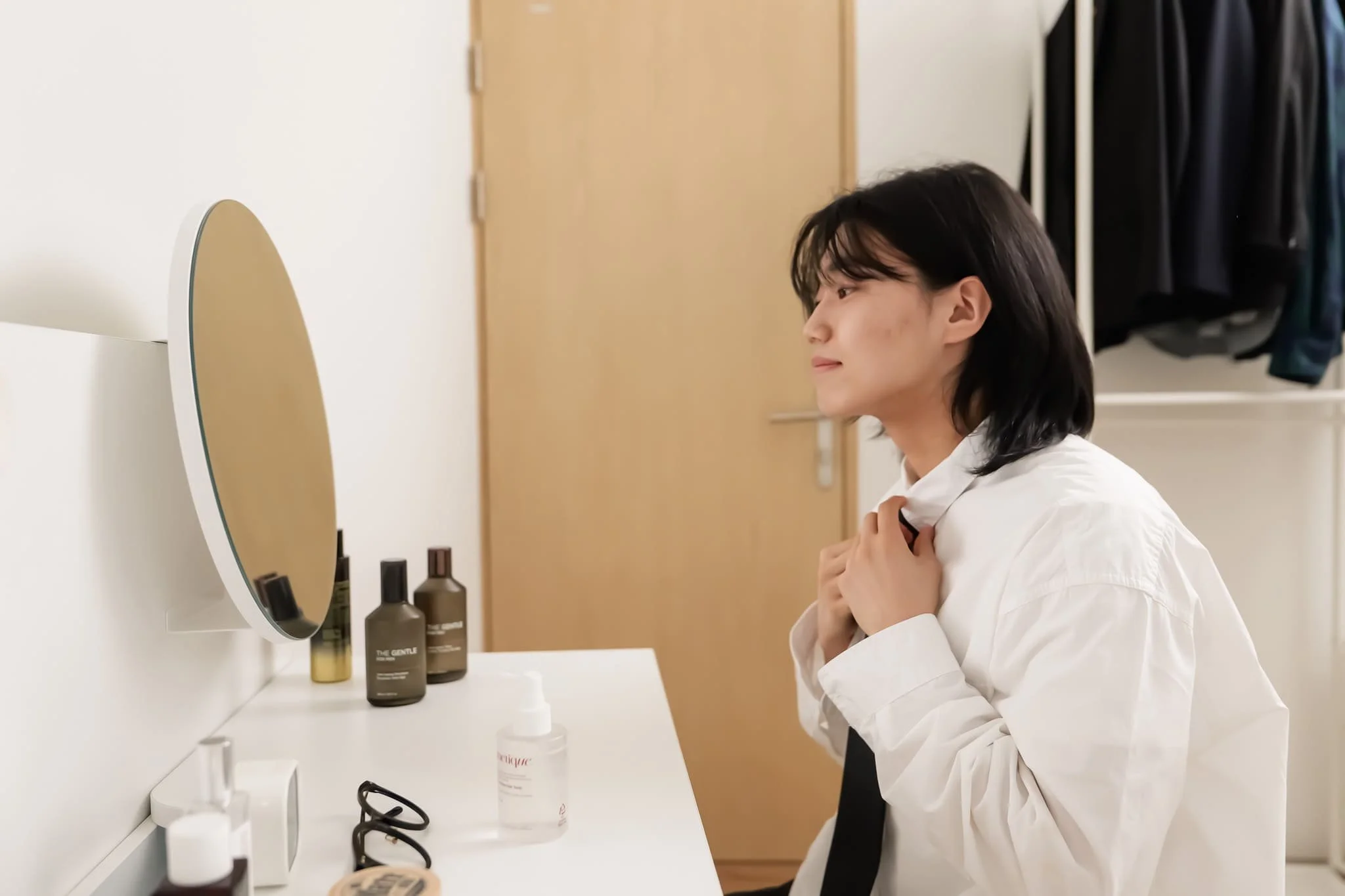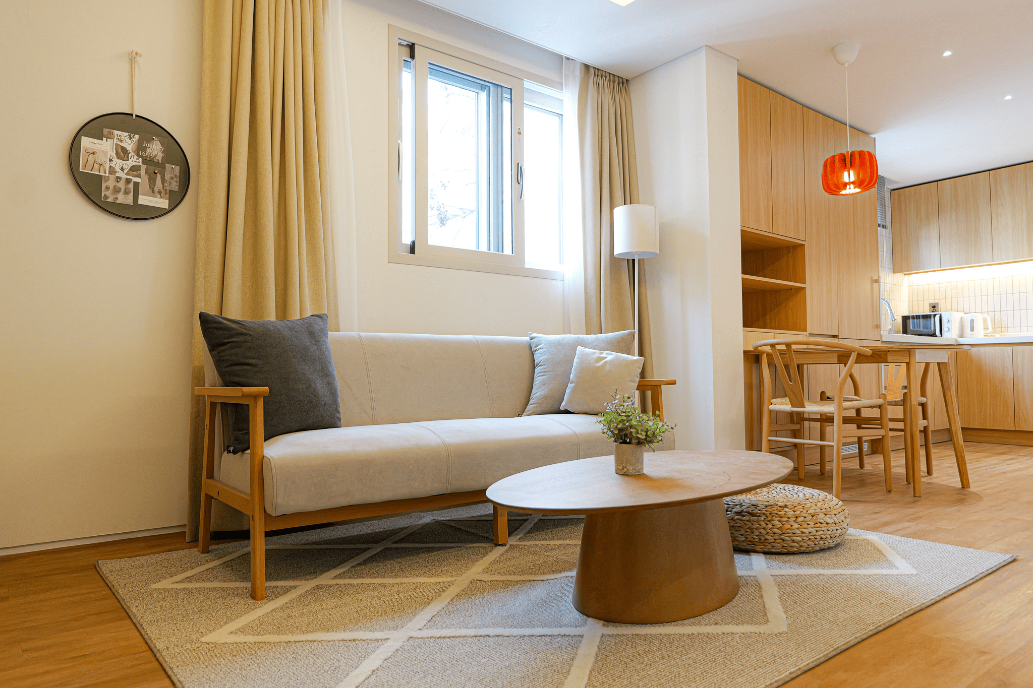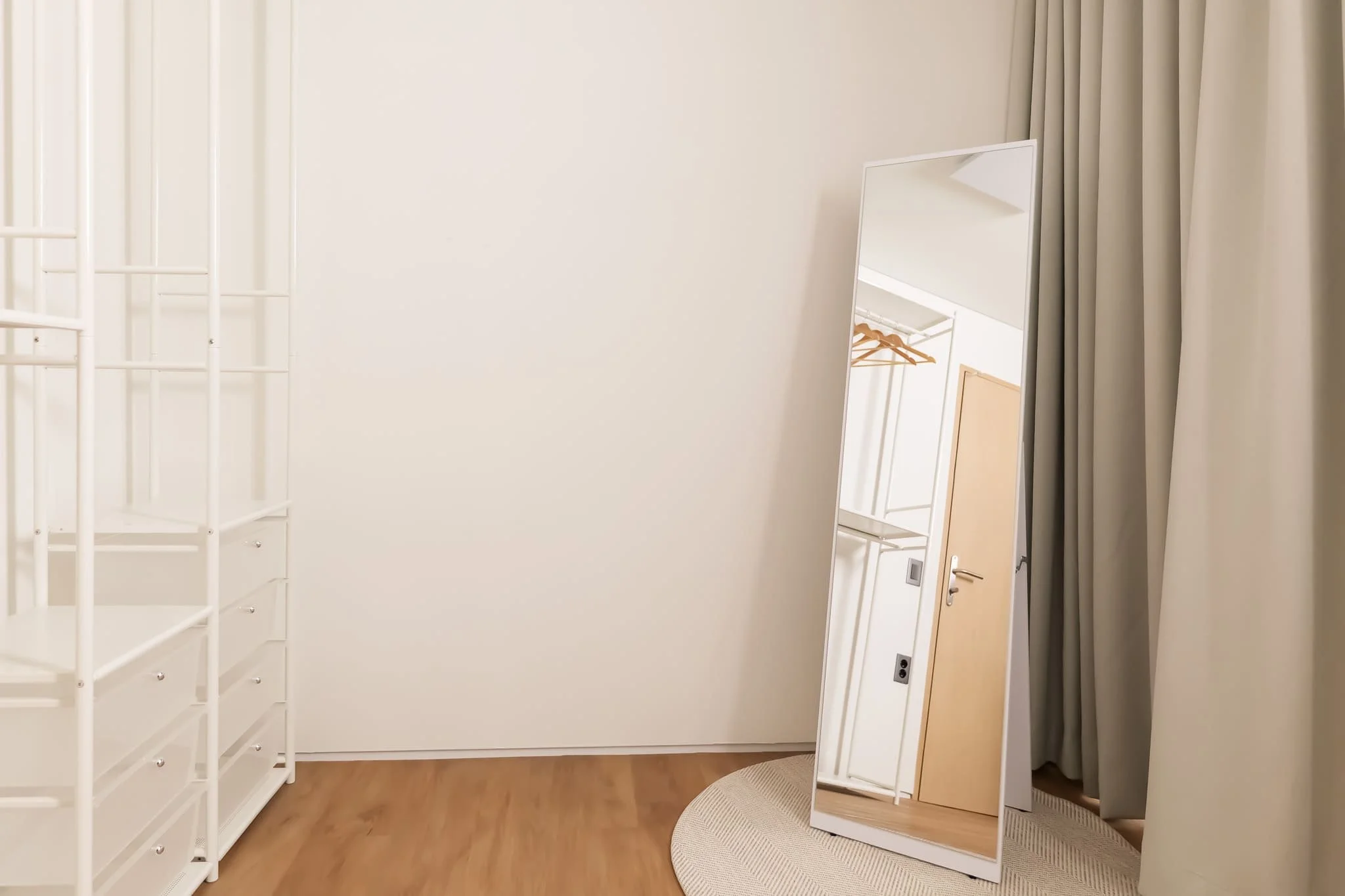 우드톤의 거실과 주방이 넓게 펼쳐진 코지한 공간입니다. 매일 아침 나만의 드레스룸에서 출근 준비를 해보는 건 어떨까요? 오픈 행거와 화장대, 전신거울이 배치되어 있어 나를 가꾸는 시간이 즐거워질 거예요.