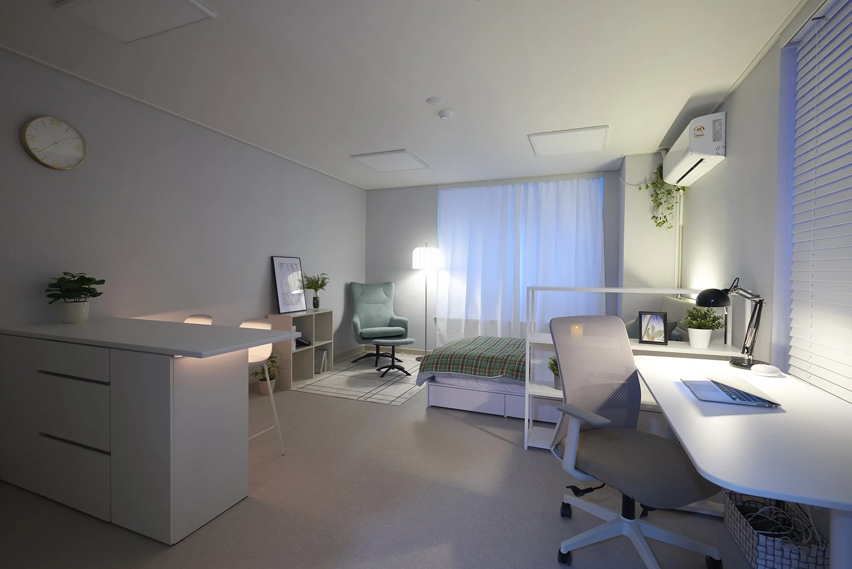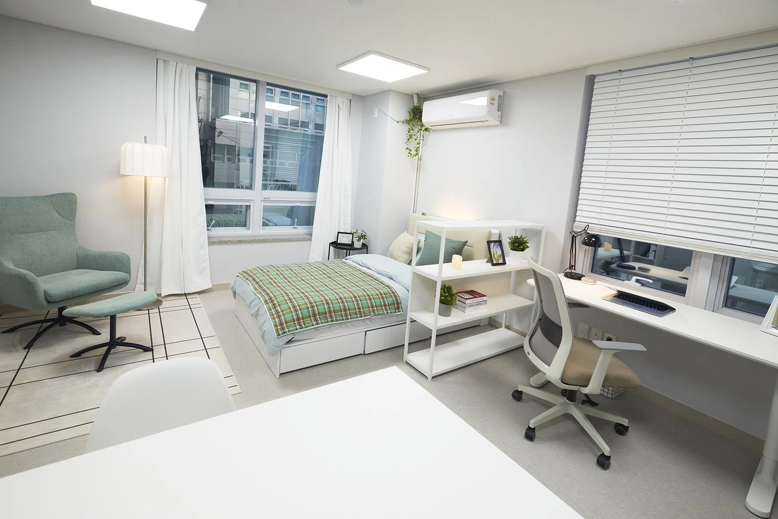 넓은 책상이 있는 업무공간과 여유롭게 식사를 할 수 있는 아일랜드 식탁이 있습니다. 편안하고 아늑한 1인 소파에서 책을 읽다가 수납장으로 분리되어 있는 침실 공간에서 잠드는걸 꿈꿔 보세요. 복잡한 도심 속, 나만의 오아시스를 마음껏 누리실 수 있을 거예요.