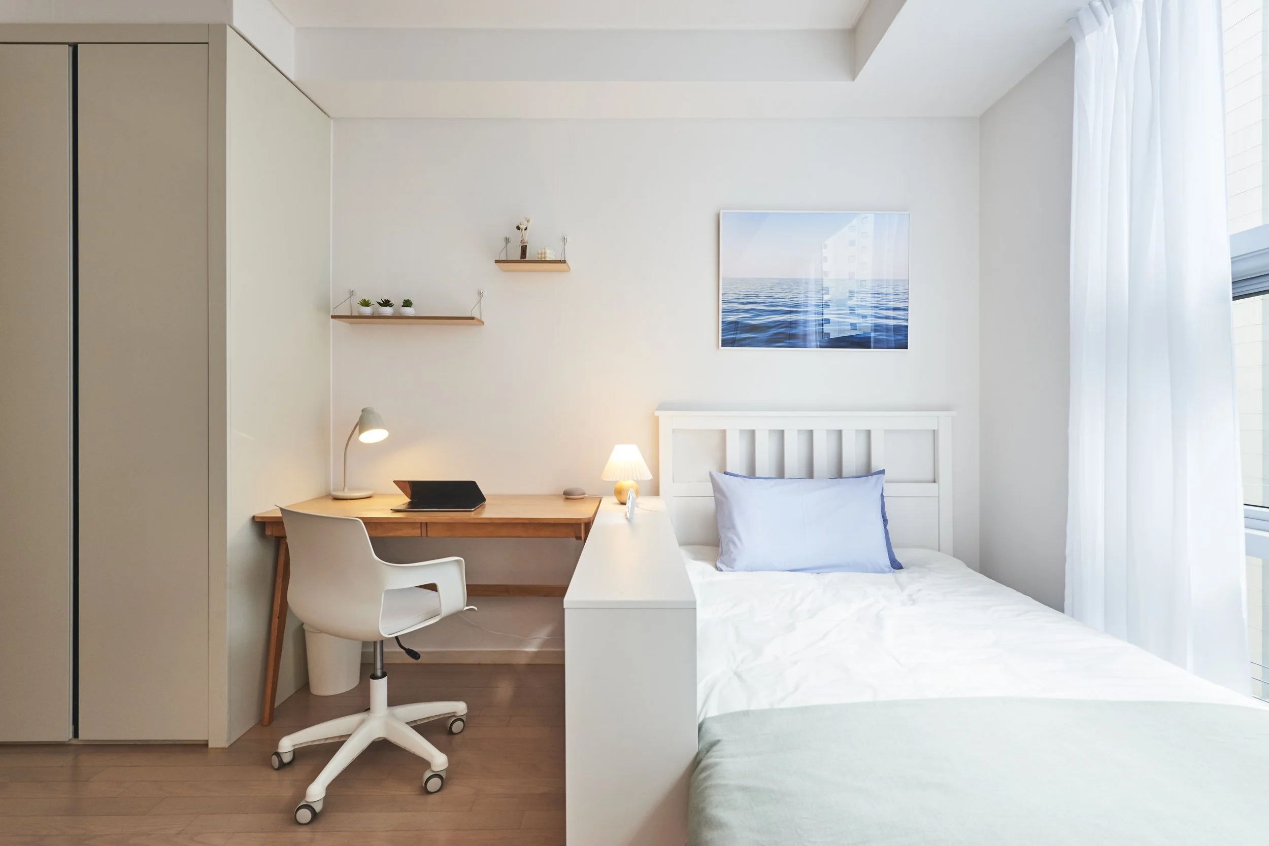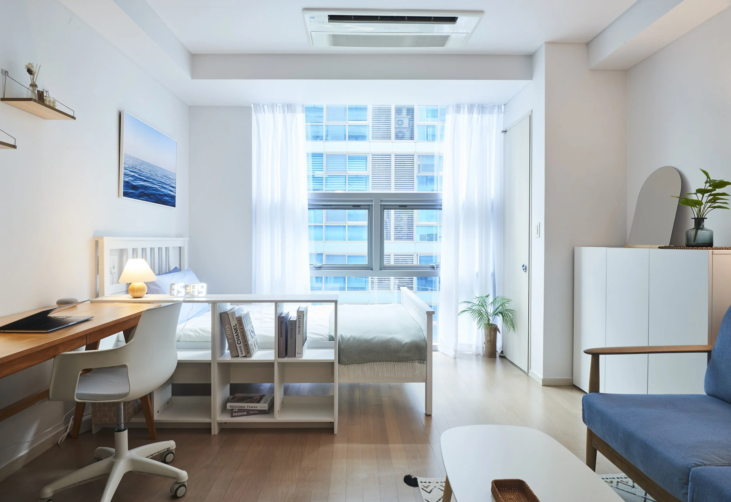 바닷가에 온 듯한 청량한 느낌을 받을 수 있는 공간입니다. 푸른 소파에 앉아 바다 사진을 보고 있으면 자연스레 마음을 가라앉힐 수 있을 거예요. 깔끔하고 산뜻한 나만의 휴식처를 찾고 계신 분들에게 딱 맞는 공간일 거에요.